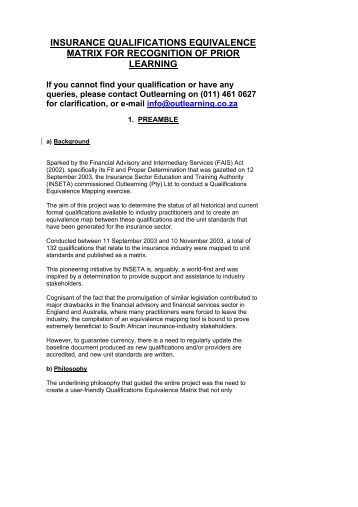 INSURANCE QUALIFICATIONS EQUIVALENCE MATRIX FOR RECOGNITION OF PRIOR incorporated insurance-specific qualifications but broad-based banking and training against specified unit standards and qualifications. A credit-bearing short course is a short training programme for which credits ... Document Retrieval